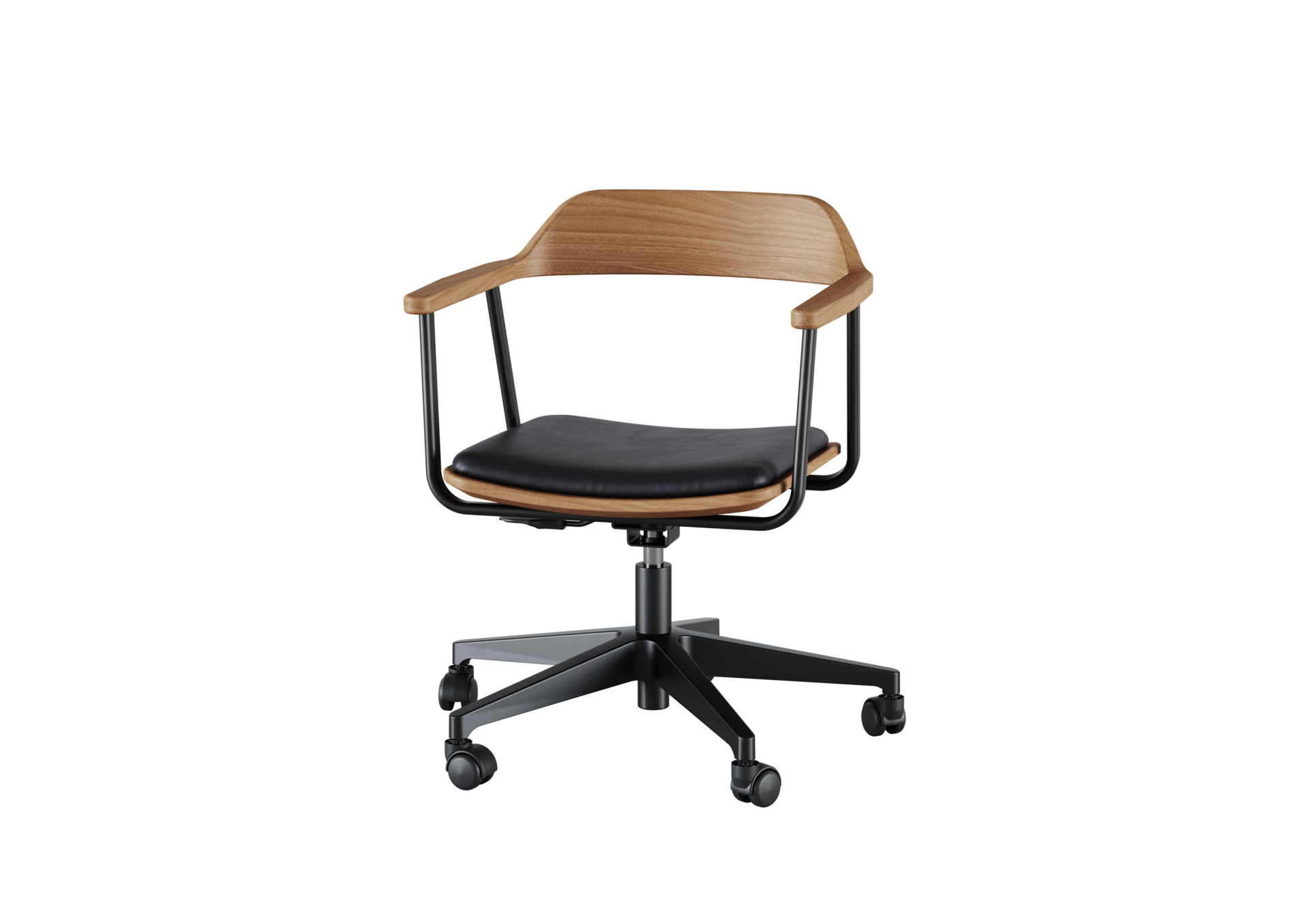 POLTRONA GIRATORIA, ENCOSTO EM MADEIRA MACIÇA JEQUITIBÁ E AÇO CARBONO PINTADO, ASSENTO ESTOFADO, BASE GIRATÓRIA COM RODÍZIOS DE ALUMÍNIO